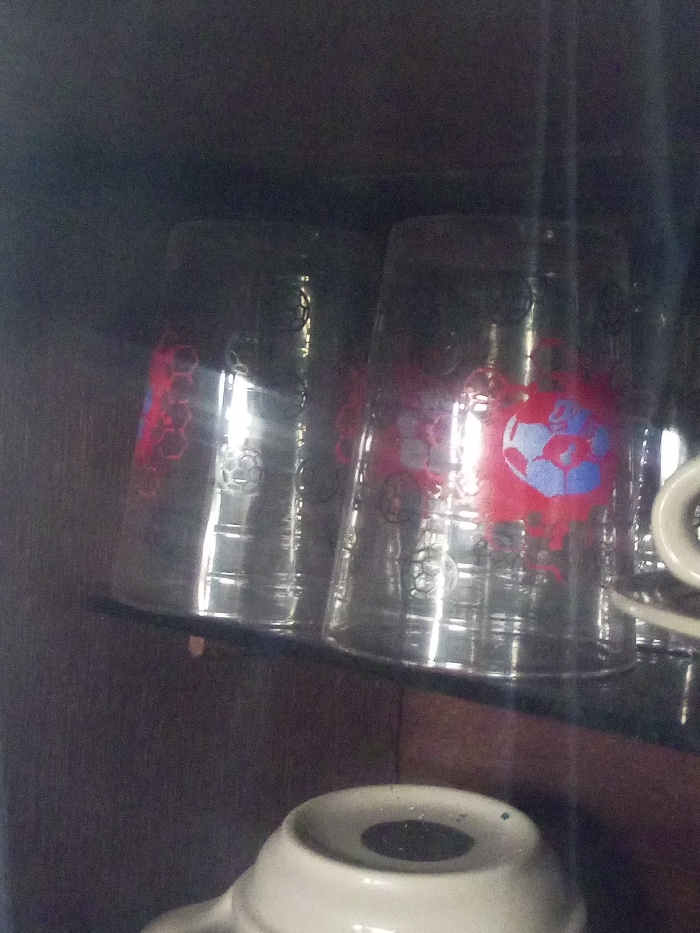 Several transparent glasses rest on a dark shelf, decorated with soccer ball designs and red accents. A white cup or bowl is partially visible below the shelf, its circular opening noticeable. The backdrop is dimly lit, suggesting the inside of a cabinet or enclosed space. The focus remains on the glassware, their details partially obscured by lighting and reflections.