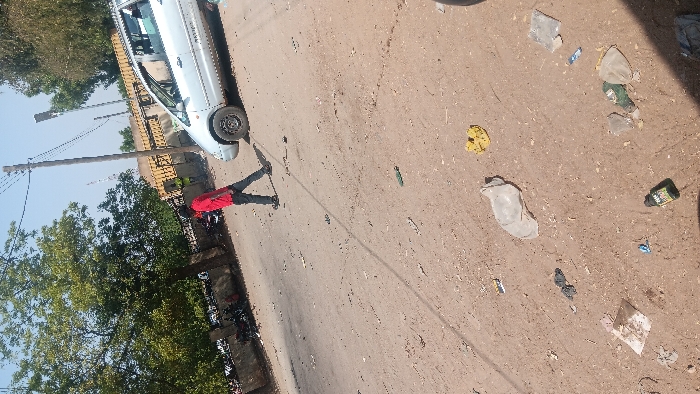 The image captures an outdoor scene on an unpaved, reddish-brown dirt road in Langtang, Nigeria, under clear daylight