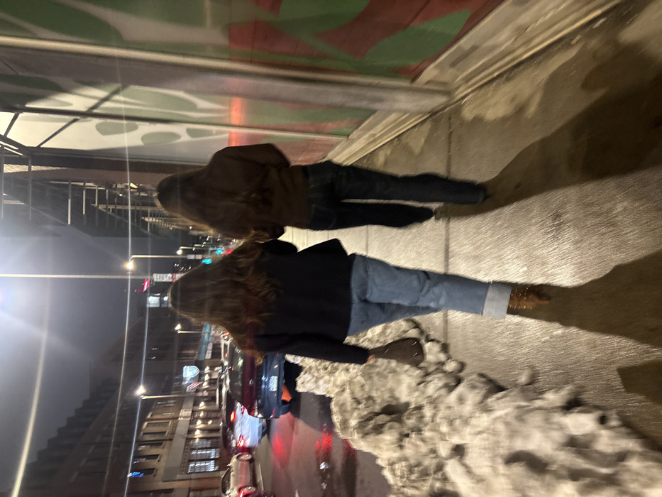 Two women walk on a sidewalk next to a street with parked cars at night. The first woman is wearing a brown jacket and dark jeans. The second woman has on a navy jacket and light blue jeans with cuffed ankles. A pile of snow sits by the curb. The background reveals buildings and streetlights under a dark sky. A decorative border sits on a wall on the upper side of the sidewalk.