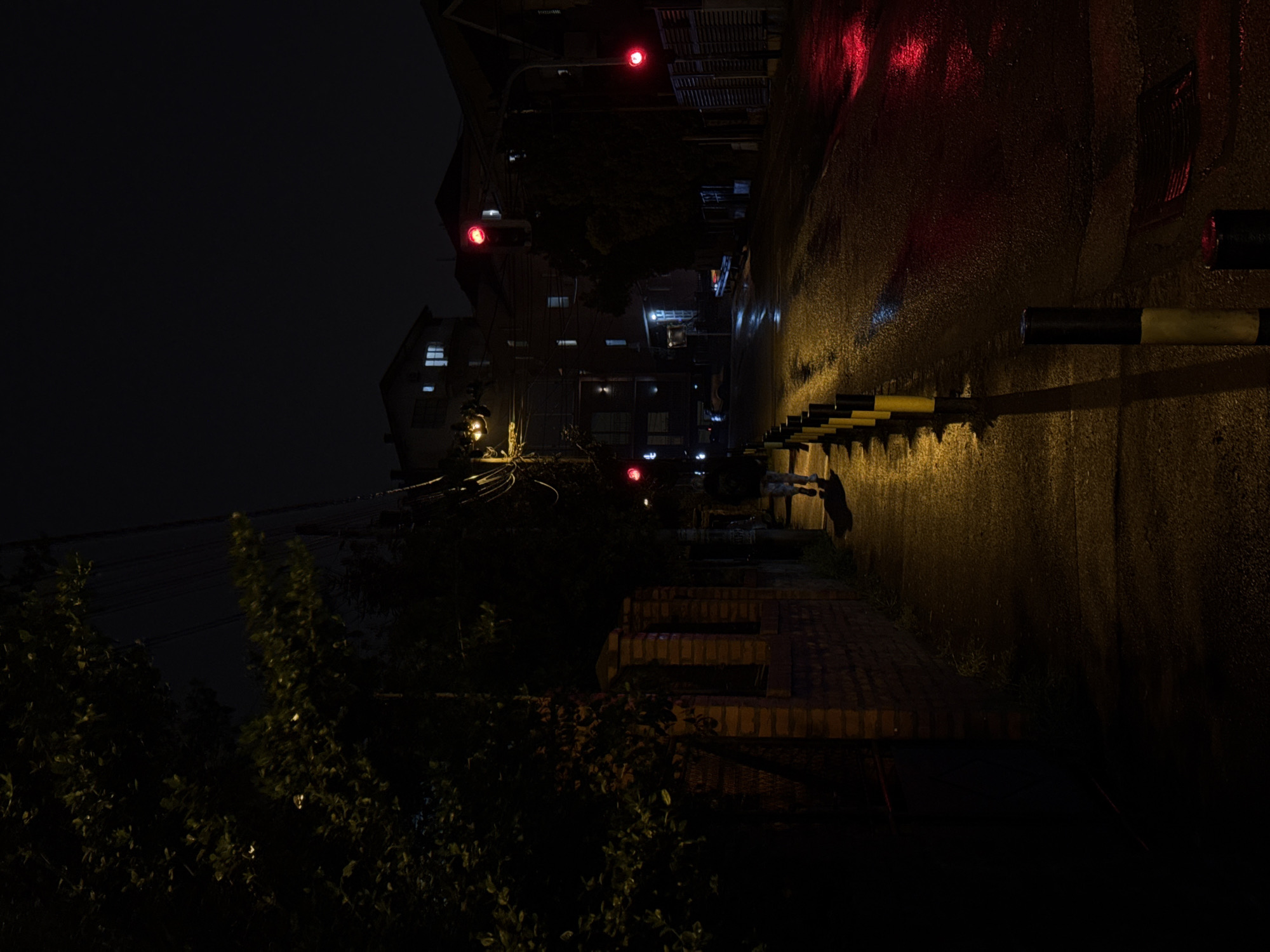 The image depicts a dimly lit street scene at night in Vozdovac Urban Municipality, Serbia. The location appears to be residential, with buildings lining the street. Several traffic lights are visible, all showing red. The street surface seems wet, reflecting the faint light sources. A series of yellow and black posts line the side of the road. Vegetation, possibly trees or bushes, is present in the foreground. A figure appears to be walking on the sidewalk adjacent to the building.