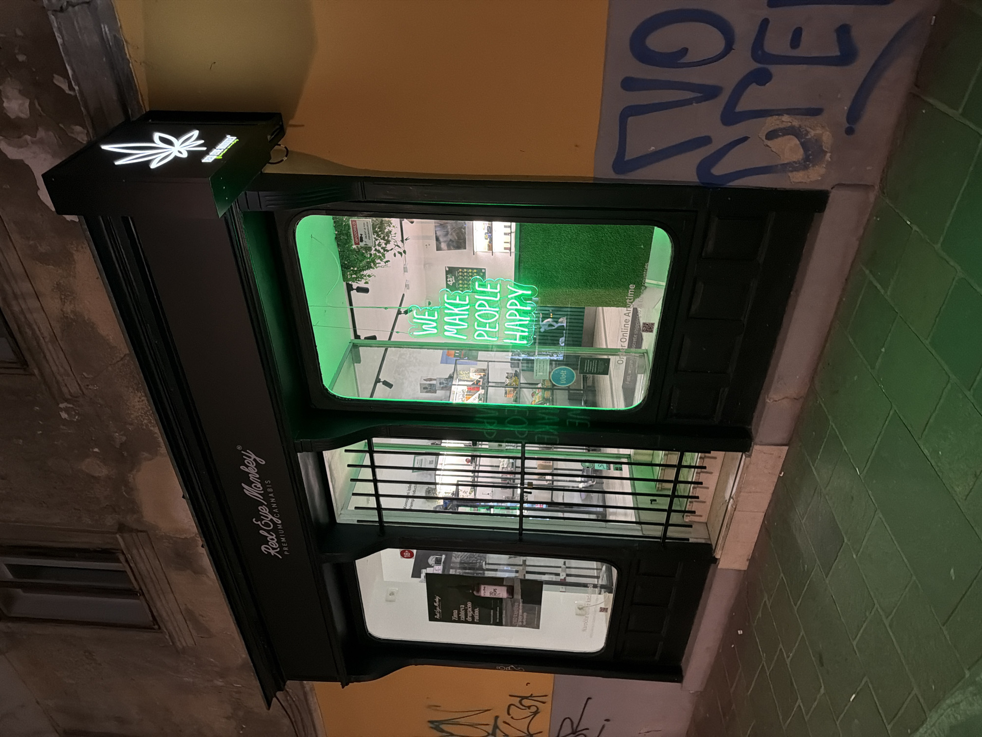 storefront in Ljubljana, Slovenia, identifiable as the "Red Eye Monkey" cannabis store based on the signage. The store has a black facade with a neon sign of a cannabis leaf and the business name. The front windows display neon signs reading "WE MAKE PEOPLE HAPPY," along with advertising materials and products inside. The exterior walls are aged, with some graffiti and weathered paint. The pavement is brick, reflecting the green light from the store. The angle of the photo suggests it was taken from a low perspective near the ground.