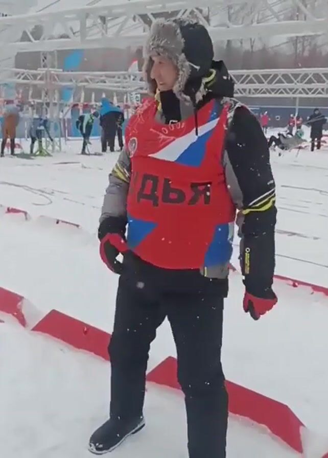 A man stands in the snow wearing a grey and black winter coat, black pants, a fur hat, and red and grey gloves. He is wearing a red vest with the word “СУДЬЯ” written across it in large Cyrillic letters, meaning "JUDGE" in English. The background shows a snowy landscape with other people moving around, possibly involved in some winter sport. There are red and white snow fences nearby, and what appears to be a metal structure with a sign that says “УДМУРТИЯ” in the background. The video appears to be slightly shaky, indicating it might be hand-held. A hand appears holding a pen and points it at the man at the end of the video. The overall setting suggests a winter sports event, with the man possibly working as a judge. The weather looks cold and snowy.