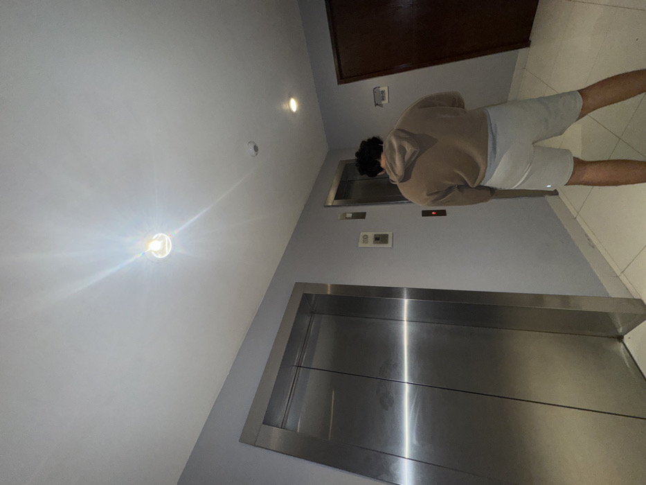 The image displays an interior hallway within a building, featuring two stainless steel elevators. A male individual, viewed from behind, stands before the right elevator. He is dressed in a tan hooded sweatshirt and light grey shorts, with dark, curly hair, appearing to wait for the elevator. The hallway walls are light grey, and the floor consists of white tiles. The white ceiling contains multiple light sources, including a bright central circular fixture generating a prominent lens flare, and a recessed spotlight. A smoke detector is also present overhead. The left elevator displays closed stainless steel doors. The right elevator's call panel, adjacent to the individual, shows a lit red button. A dark brown wooden door with a small white sign is visible on the far right. The specific location within Puebla City, Mexico, cannot be determined from the provided visual information.