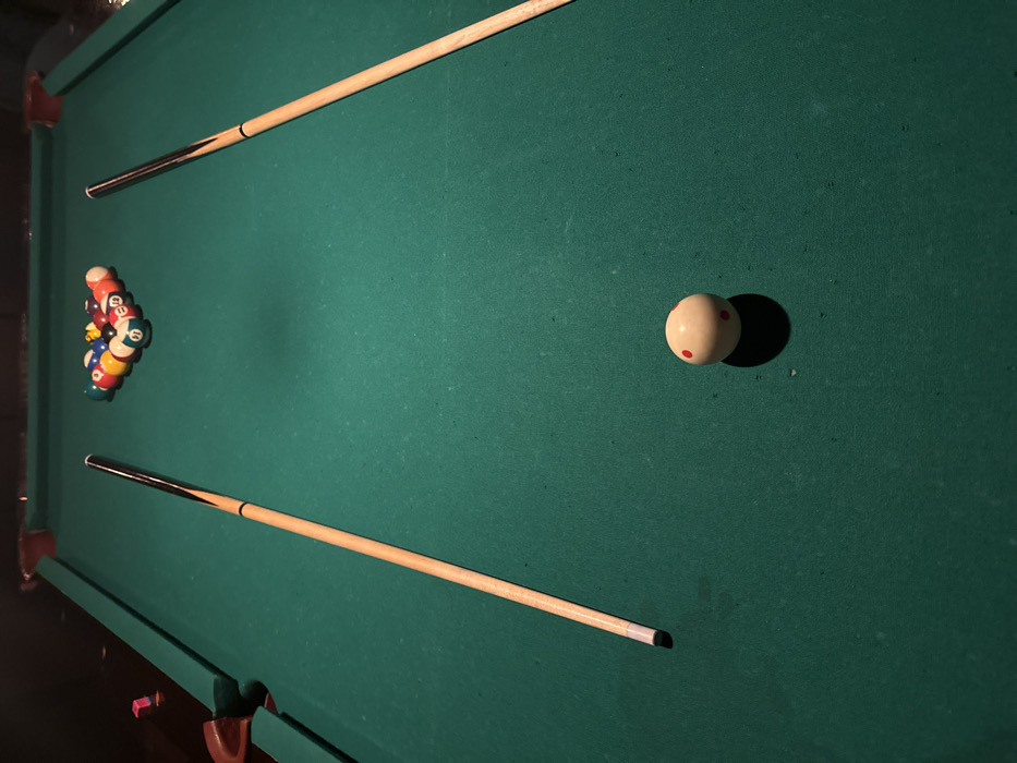 A green pool table displays a rack of billiard balls in the corner. Two pool cues lie horizontally, one above and one below the balls. A cue ball with two red dots sits alone in the center of the table, casting a dark shadow. The table's wooden trim and corner pockets are visible.