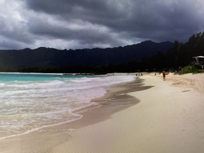 The image displays a coastal landscape featuring a sandy beach, ocean, and mountains under a heavily overcast sky