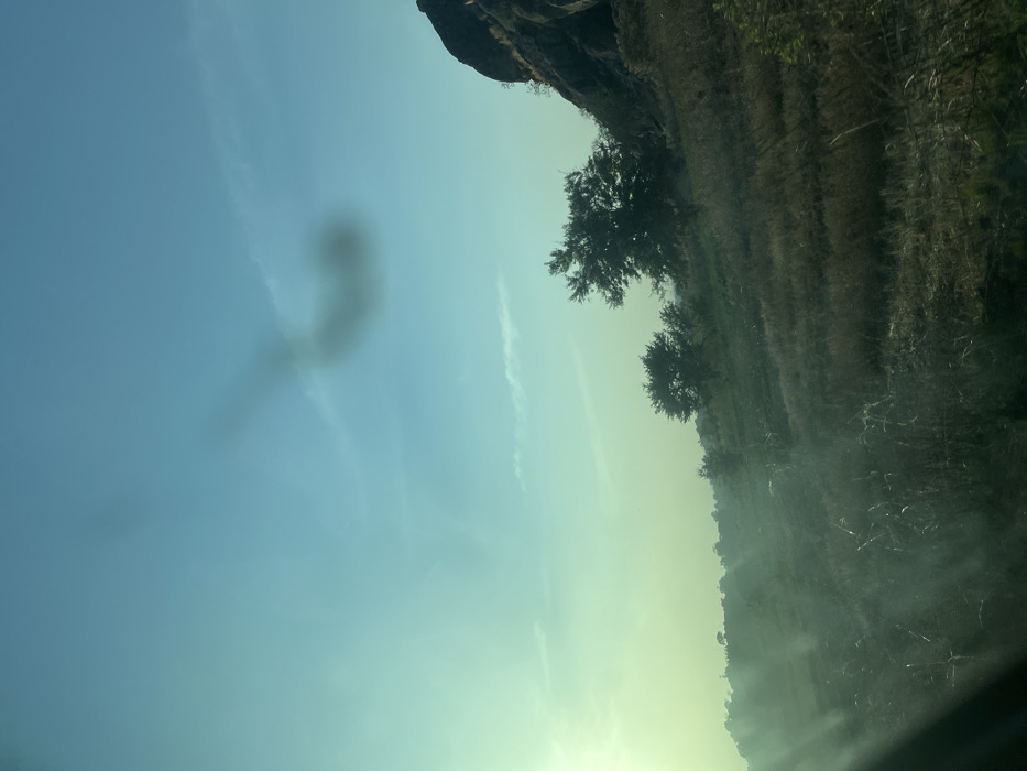 A landscape image features a steep, grassy hillside meeting a blue and hazy sky. Trees are sparsely dotted on the upper part of the hill. Hints of sunlight glow from the bottom right, giving the sky a slight yellow tint. A rock overhang appears at the top left. A blurry object is in the upper left corner of the image.