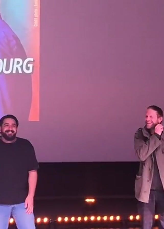 four men standing on a stage in front of a large screen. The screen displays an image of two men and text that reads "On Man Show, Julien Strelzyk, France vs Luxembourg, Vilmools Merci!". The men on the stage are smiling and appear to be interacting with each other. The man on the right is wearing a jacket and adjusting his collar. The stage is dark with several small lights arranged along the front edge.