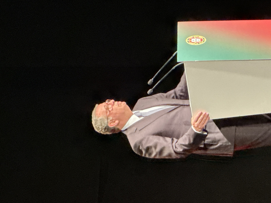A man in a gray suit and glasses stands behind a podium. The podium's front is white, and the top is decorated with green and red colors and an emblem. Two microphones are in front of him. The background is dark, focusing attention on the man and the podium. His head is tilted up, and his hands are visible on the podium's edge.
