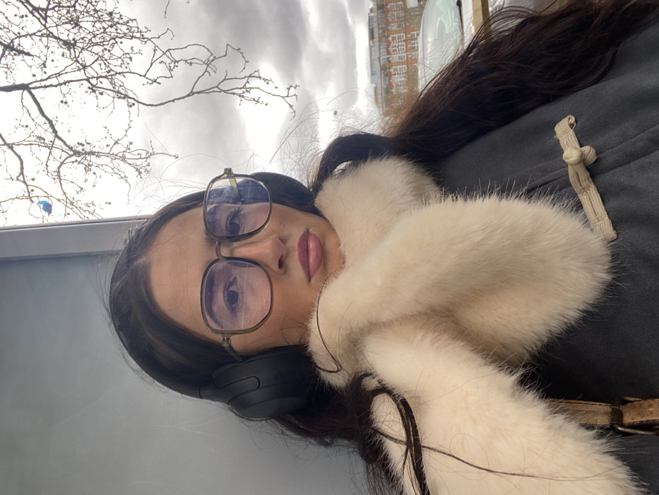 The image presents a close-up portrait of a female individual situated in an urban street setting within London, United Kingdom, under an overcast sky. The subject, positioned centrally, has long, dark hair, wears large, dark-framed eyeglasses with anti-reflective coating, and black over-ear headphones. She is attired in a dark grey coat, fastened with a beige fabric toggle closure visible on her right side, and a cream-colored fur stole wrapped around her neck. A light brown strap, likely from a bag, is visible over her left shoulder. Her gaze is directed straight at the camera with a neutral expression. The background features bare tree branches against a cloudy sky, and further in the distance, multi-story brick buildings typical of London architecture are visible alongside a light-colored parked vehicle on a street. A reflective surface to the subject's left partially obscures the immediate background and reflects a small blue object, possibly a balloon, entangled in the tree.