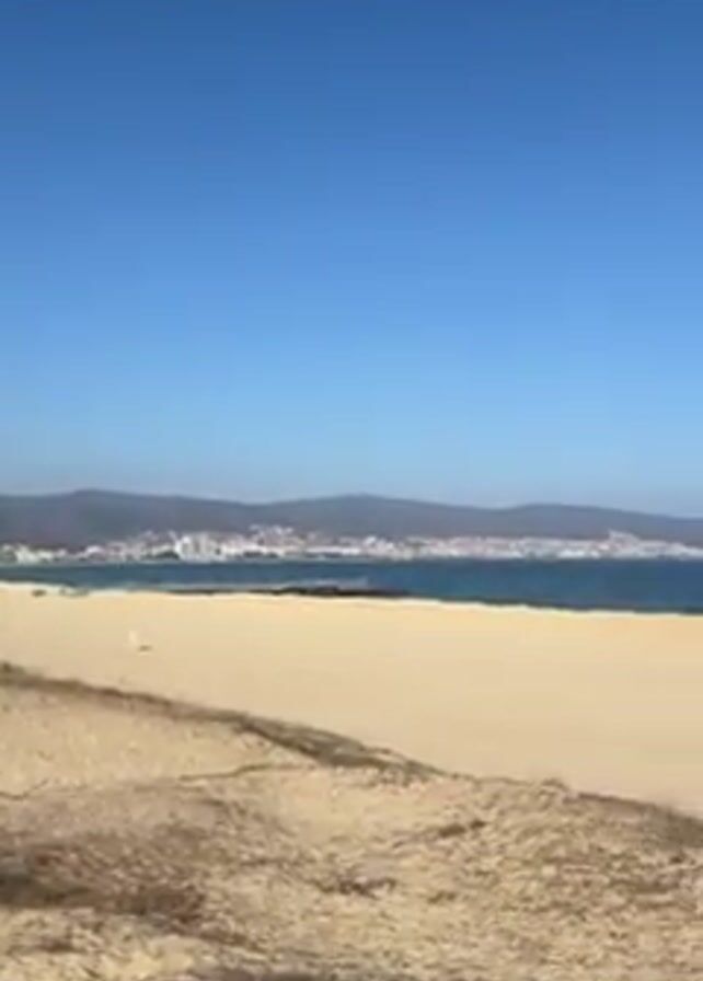 panorama of a wide, sandy beach stretching towards the ocean under a clear blue sky. In the distance, a city skyline is visible against a backdrop of low mountains. The beach is mostly empty, except for a solitary figure walking along the shoreline. As the camera pans, small buildings or structures become visible further down the beach. The foreground shows sand dunes covered with sparse vegetation. Towards the end of the video, the camera focuses on a small white building near a bare tree, also on the dunes.