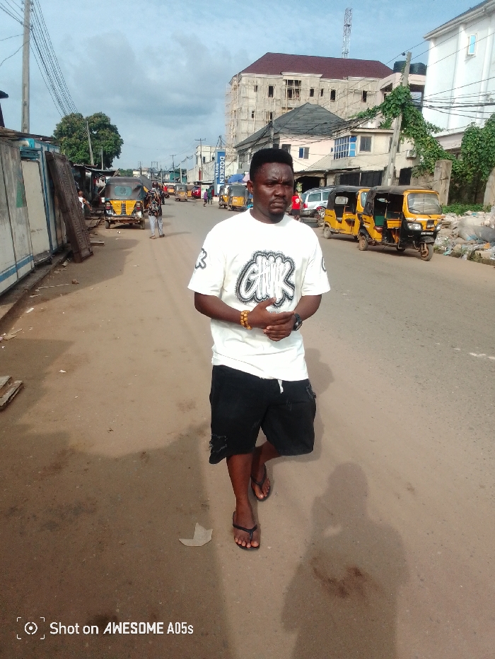 An outdoor scene captured on a partly cloudy day depicts a male subject standing on a brownish, unpaved street in Onitsha, Nigeria