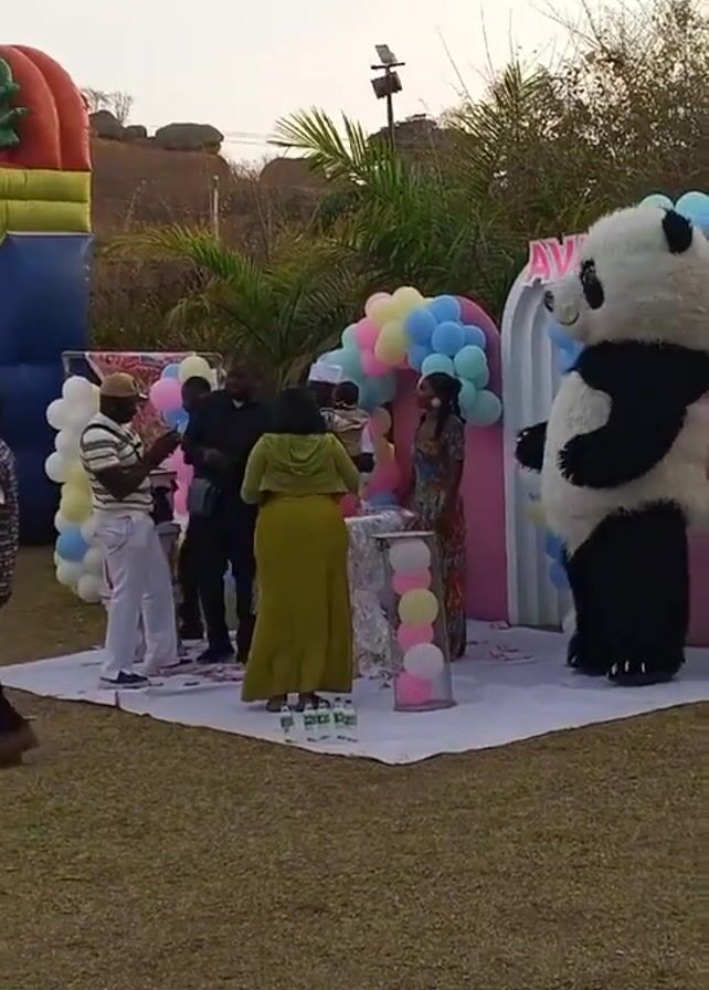 birthday party taking place outdoors on a grassy lawn. In the center of the frame is a decorated platform with pastel-colored balloons arranged in arches, a small table, and a large panda mascot standing beside it. Several people are gathered around the platform. One man wears a black suit and appears to be providing security. Another man in a striped shirt and white pants seems to be taking photos. A woman in a long green dress stands near the table, while another woman in a colorful patterned dress holds a child. A large inflatable bounce house is visible in the background. The sky is bright, suggesting it is daytime. The setting seems to be a park or open area, as there are trees and some rocky hills in the distance.