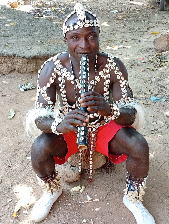 An adult male, dark-skinned, is seated on the ground outdoors in Jos, Nigeria, looking directly into the camera. He is adorned with extensive cowrie shell decorations, including a prominent headpiece, multiple strands forming necklaces and crisscrossing his bare chest and shoulders, and bracelets on his forearms. White fibrous material, resembling raffia, is attached to his upper arms as armbands. He wears red shorts and distinct anklets made of cowrie shells and spiked elements, secured with thin cords. His feet are clad in modern white athletic shoes with laces. The man holds a dark, cylindrical wind instrument, possibly a flute or recorder, embellished with cowrie shells, to his lips with both hands, his fingers positioned on its body. The ground beneath him is dry, reddish-brown earth, strewn with scattered dry leaves, small rocks, and minor debris. Behind him, a raised dirt bank is visible, with a darker, possibly compacted or paved surface in the background. The scene is brightly lit by natural light.
