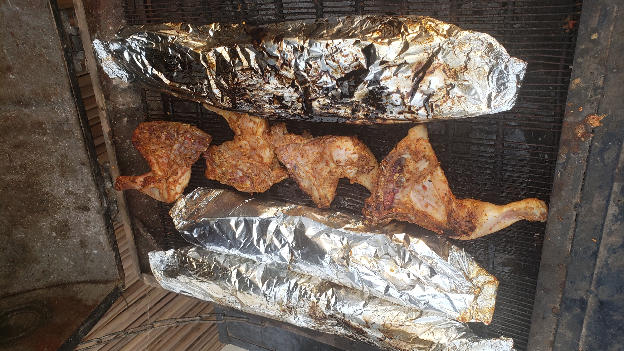 This image captures a close-up, top-down view of a metal barbecue grill located in Narayi, Nigeria. The grill features a dark, heavily soiled metal grate. Placed directly on the grate are four pieces of raw or partially cooked chicken, appearing to be legs and thighs, coated with a reddish-orange seasoning or marinade containing visible spices and possibly chili flakes. Adjacent to the chicken are three elongated items wrapped in aluminum foil. Two items on the left are wrapped in relatively shiny, reflective silver foil, while the item on the right is encased in foil that appears significantly darker and stained, possibly from grease or charring during cooking. The area directly above the grill shows a sooty, possibly concrete or metal structure. To the upper left, a metal chain hangs downwards, and a light-colored, woven material, possibly thatch or bamboo, is visible in the background, suggesting an outdoor or semi-sheltered cooking environment. No individuals are visible in the scene. The overall scene depicts food items being prepared on a rustic grilling setup.