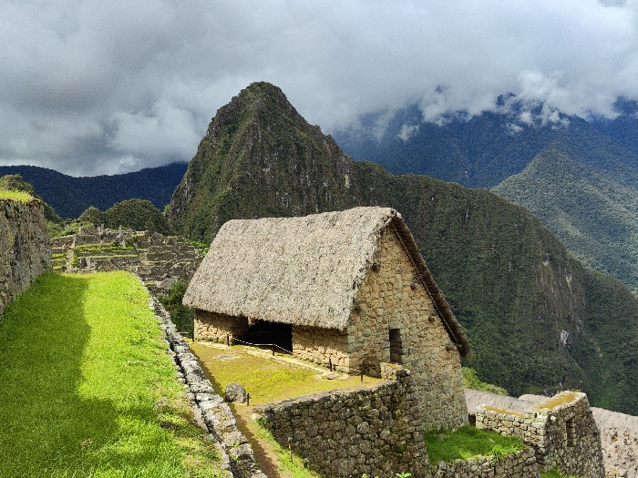 A stone hut with a thatched roof nestles on a green, grassy terrace in Machu Picchu