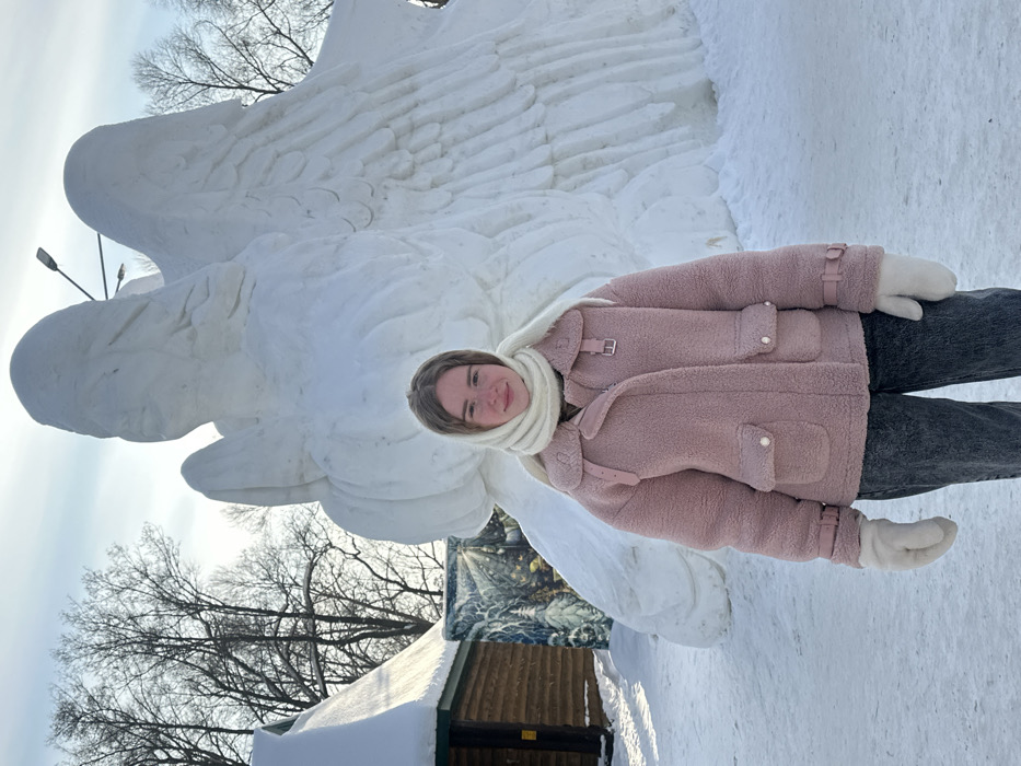 This image captures a winter scene in Местечко Раифа, Russia, on a clear, bright day. In the foreground, a young female, approximately 16-25 years old, stands centrally, facing the camera with a neutral expression. She is dressed in a light pink faux shearling jacket with a collar, four flap pockets featuring light-colored buttons, and matching buckle straps on the shoulders and cuffs. Her head is covered by a cream-colored knitted scarf, and she wears dark grey pants and white mittens. Behind her, a massive, multi-ton white snow sculpture dominates the midground, depicting a stylized angelic or bird-like figure with large, textured wings. To the far left, a rustic, dark brown wooden building with a snow-covered peaked roof is partially visible. Adjacent to this building is a vertical decorative panel showcasing a glowing winter forest scene. The ground is entirely covered in undisturbed snow. In the background, leafless deciduous trees are visible against a bright blue sky, with a modern street light fixture extending upwards behind the snow sculpture. The scene suggests an outdoor winter display or festival environment.