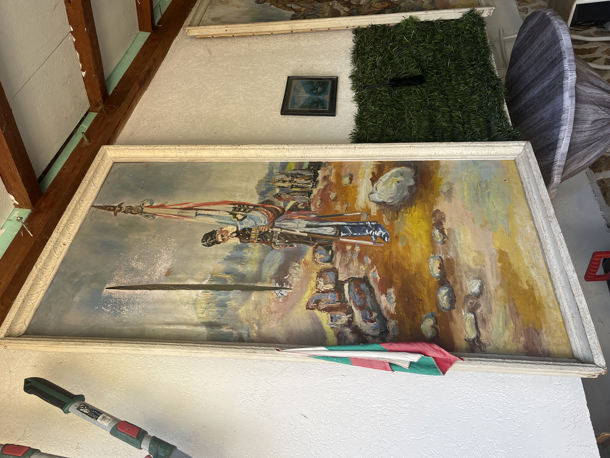 The image depicts a painting in a white frame hanging on a white wall. The painting appears to be of a soldier, possibly from a historical period, rendered in an impressionistic style. Above the painting, also mounted on the wall, is a smaller, dark-framed picture and a rectangular patch of artificial greenery. In the upper left, exposed wooden beams form part of the room's structure. In the lower left, part of a green and red garden tool is visible. To the upper right, a grey chair stands next to the wall. The location is Pokrovnik, Bulgaria.