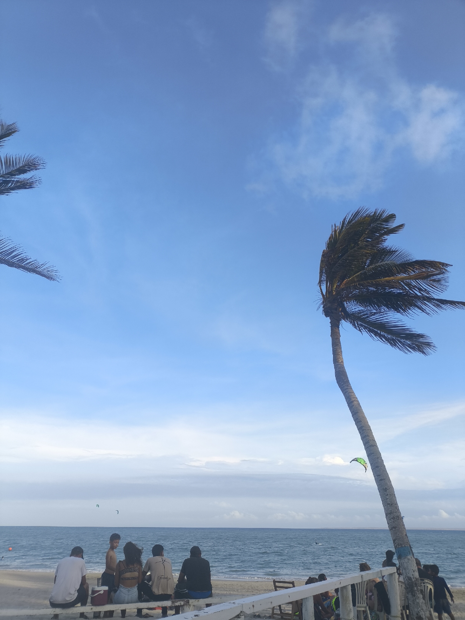 beach scene in El Yaque, Venezuela. A group of people are seated on a bench facing the ocean. Several kites are visible in the sky, suggesting windsurfing or kitesurfing activity. A palm tree stands prominently on the right side of the frame, with its fronds being blown by the wind. Another tree appears on the left. The sky is blue with scattered clouds. The beach is sandy and meets the water's edge. Several other people and chairs are seen nearby.