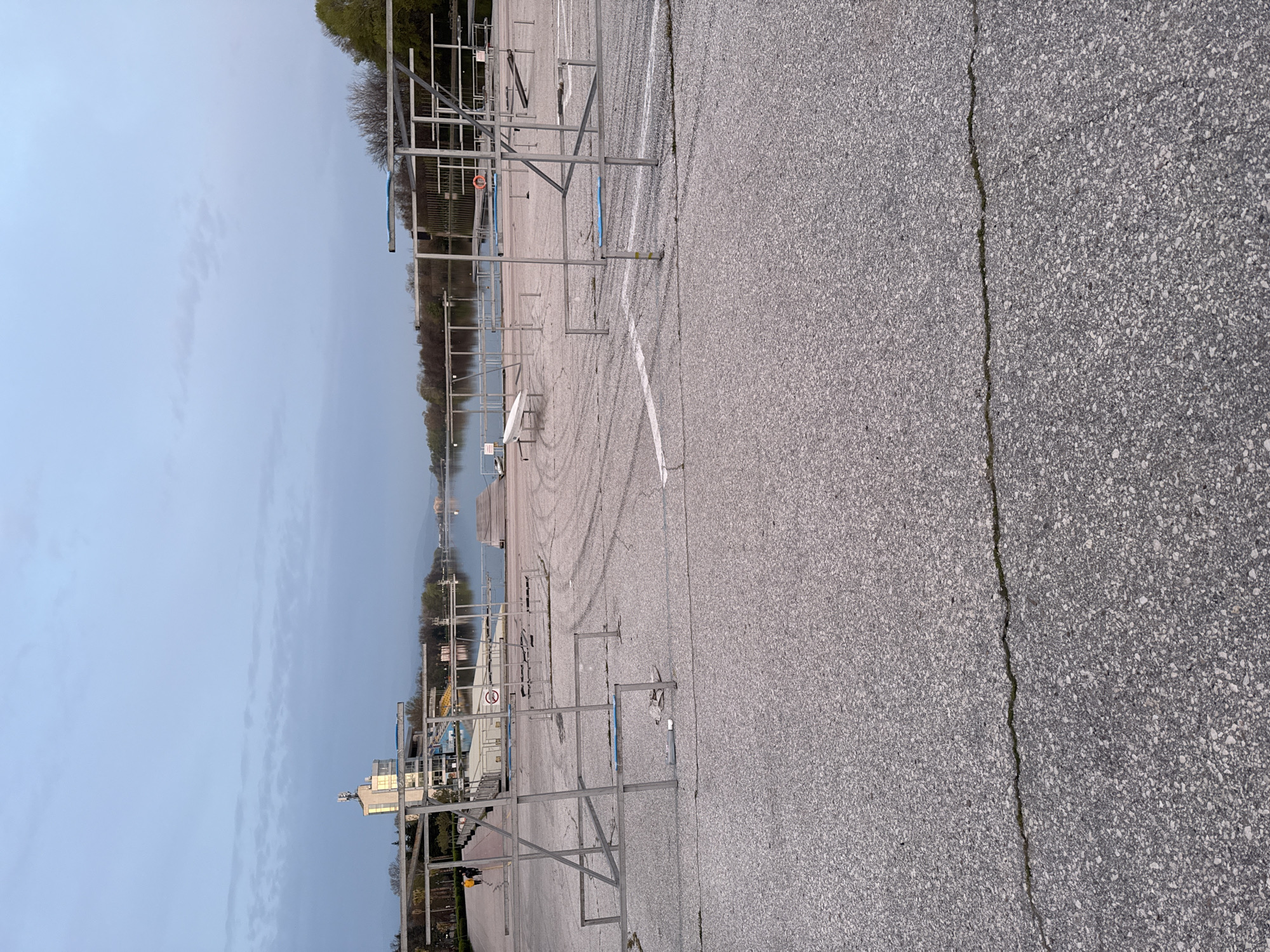 n outdoor scene in Plovdiv, Bulgaria, featuring a paved lot with metal frame structures, possibly related to an event setup or storage. The lot shows signs of wear, including cracks and tire marks. In the background, there is a body of water (likely the Maritsa River), and buildings visible along the waterfront. The sky is overcast. The foreground contains a section of pavement with visible cracks and a painted white line.