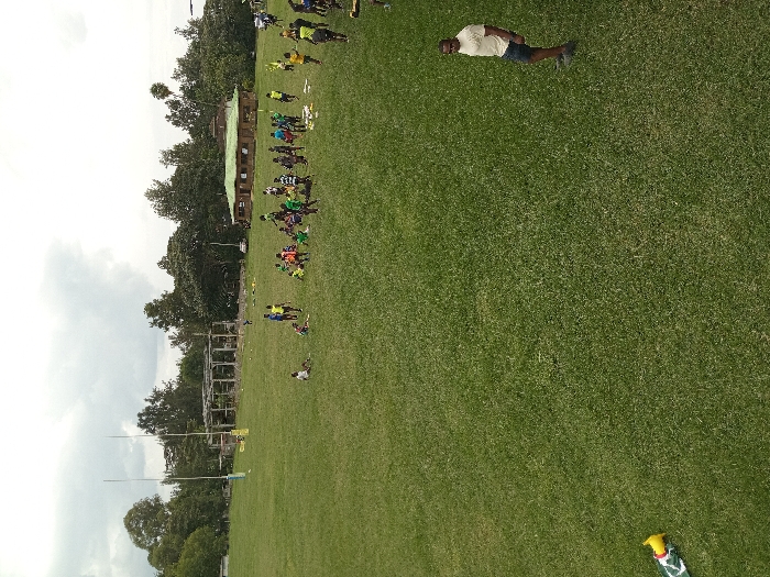 This image depicts a green grass sports field in Nakuru, Kenya, under an overcast sky