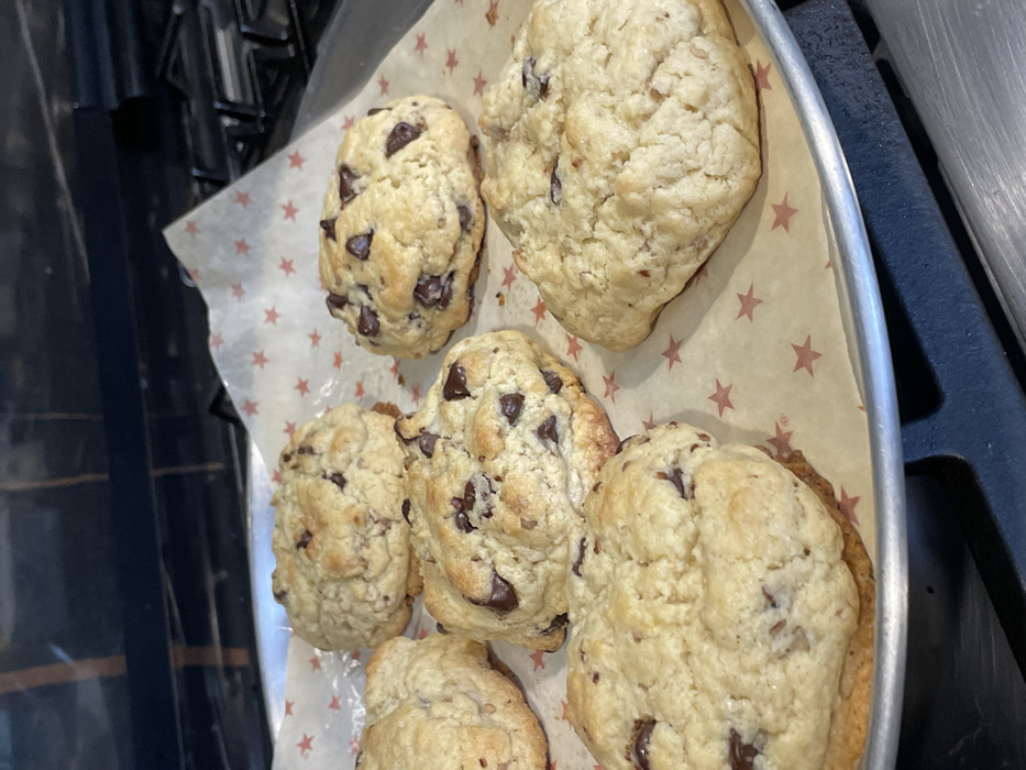 - "This image captures six freshly baked chocolate chip cookies resting on a round metallic baking tray" by FM-ckPo02, licensed under CC BY 4.0