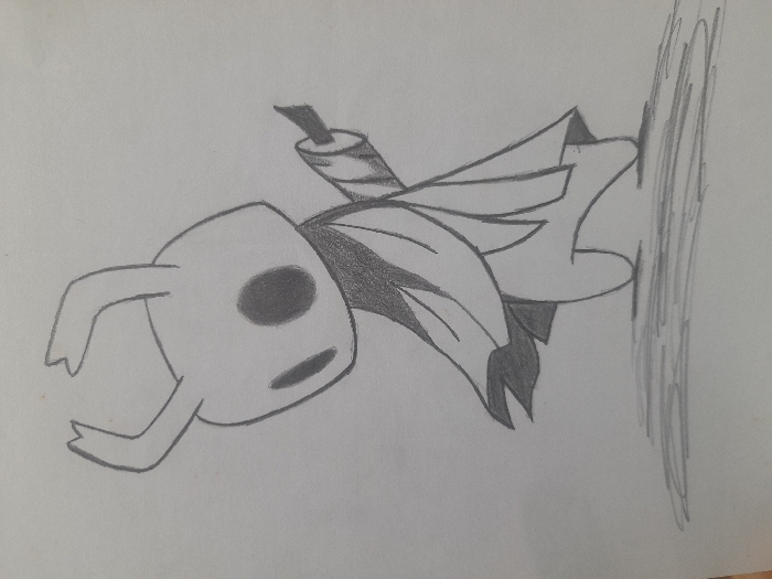 The image presents a monochrome graphite pencil drawing on a plain, light-toned paper substrate. The primary subject is a stylized, anthropomorphic character, consistent with "The Knight" from the Hollow Knight video game series. The figure possesses a smooth, untextured head, roughly ovoid, from which two segmented, horn-like appendages extend upwards and outwards, each terminating in a truncated point. The facial area features two solid, deeply shaded ovoid depressions, indicating eyes. A small, rounded torso is enveloped by a voluminous, dark cloak, rendered with varying shades of graphite to depict draping folds and shadow. The character's right limb extends laterally, grasping a slender, dark, bladed implement resembling a nail or sword. The lower extremities are depicted as two simplified, rounded forms in a posed stride. A horizontal, irregularly shaded line pattern beneath the figure represents a ground plane or cast shadow. The background is devoid of additional contextual elements. This drawing is located in the city of Tinaquillo, Venezuela.