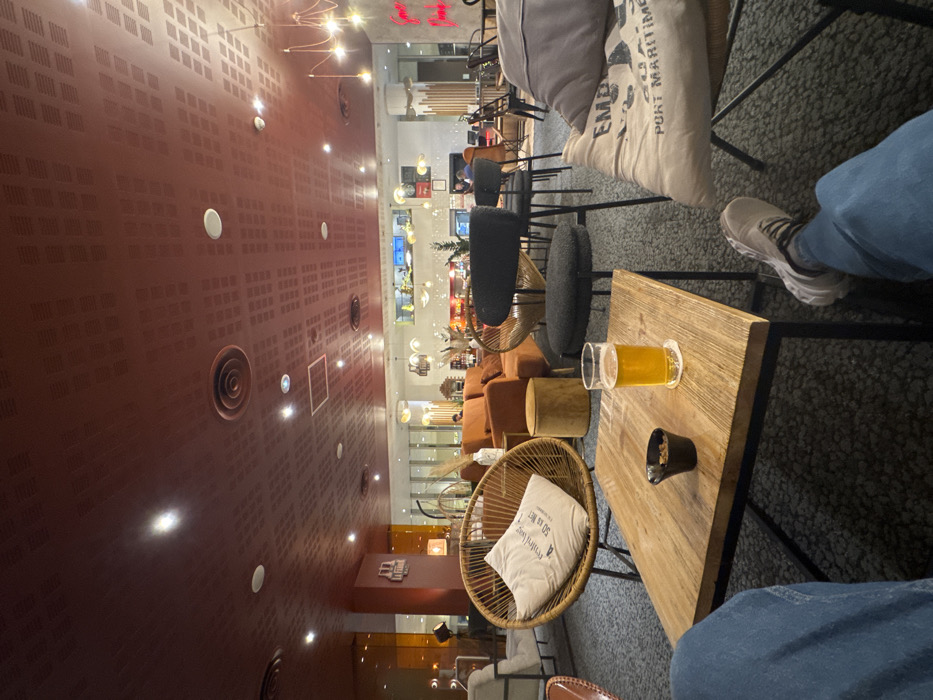 The image depicts an indoor cafe setting, with a focus on a wooden table holding a glass of beer and a small black container. A woven chair with a white cushion sits next to the table, while various seating arrangements fill the background, including chairs and a lounge area. A man's legs and a sneaker are partially visible, adding a personal perspective. The ceiling is textured with a pattern, adorned with recessed lighting and ventilation units. The scene suggests a relaxed ambiance.