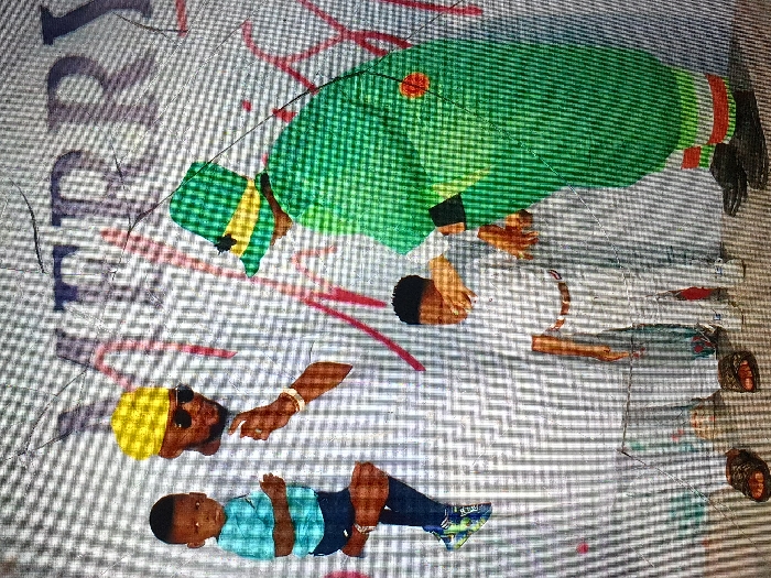 This image is a photograph of a display or screen exhibiting a grid pattern and distressed red lettering partially spelling "MERRY," located in Ijegun, Nigeria. The scene features four individuals. On the left, a young boy in a blue and white checkered shirt and dark shorts stands beside a taller adult male. The adult wears a yellow beanie, dark sunglasses, a white long-sleeved garment, and brown slippers, with his right index finger raised. To the right, another young boy in a white shirt and light pants stands, partially obscured by the hand of a second adult figure. This second adult is clad in a green wide-brimmed hat with a yellow band, a green patterned full-body garment with red and white trim, and black shoes, and is extending a hand towards the younger boy's head. The entire image is affected by faint linear distortions and surface imperfections.