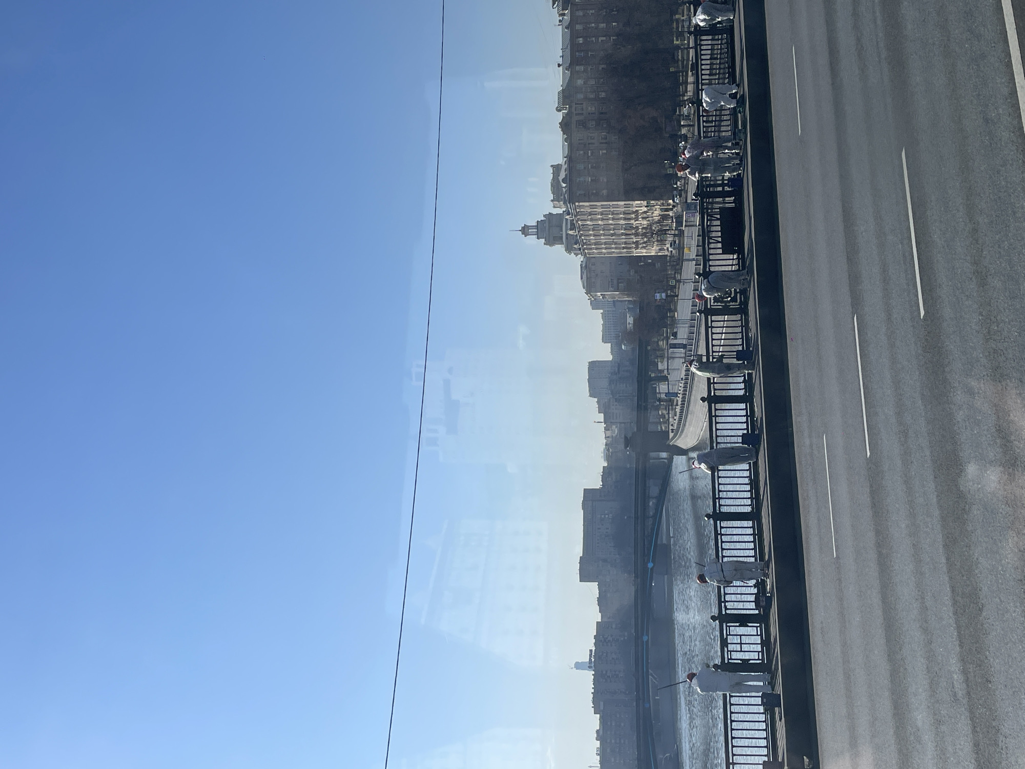 view from a high vantage point, possibly a window, overlooking a cityscape alongside a bridge. The scene is set in Moscow, Russia. The right side of the image features a road with painted white lines, while a metal railing separates the road from the riverbank. On the bank, several individuals in white protective suits are performing maintenance or cleaning activities, visible along the riverfront. The architecture of the buildings across the river is typical of Moscow, with varying heights and designs. The sky is clear and blue, reflecting in the river's surface. A cable or wire runs vertically through the frame, likely part of the window structure from where the photo was taken.