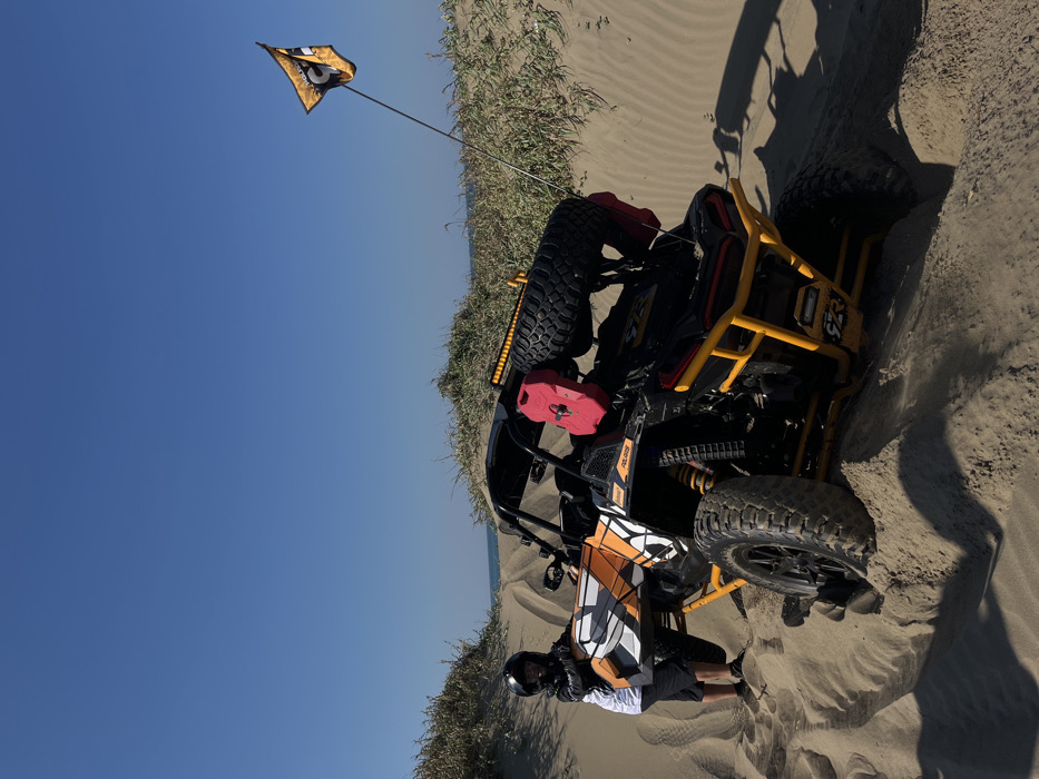 An off-road vehicle sits on a sandy dune under a bright blue sky. The vehicle is yellow and black with a tall safety flag attached. A spare tire and a red fuel can are mounted on the back. A person in a helmet and black clothing is near the front wheel, partly obscured by the dune buggy's orange and white panels. The surrounding terrain is sandy with some vegetation.
