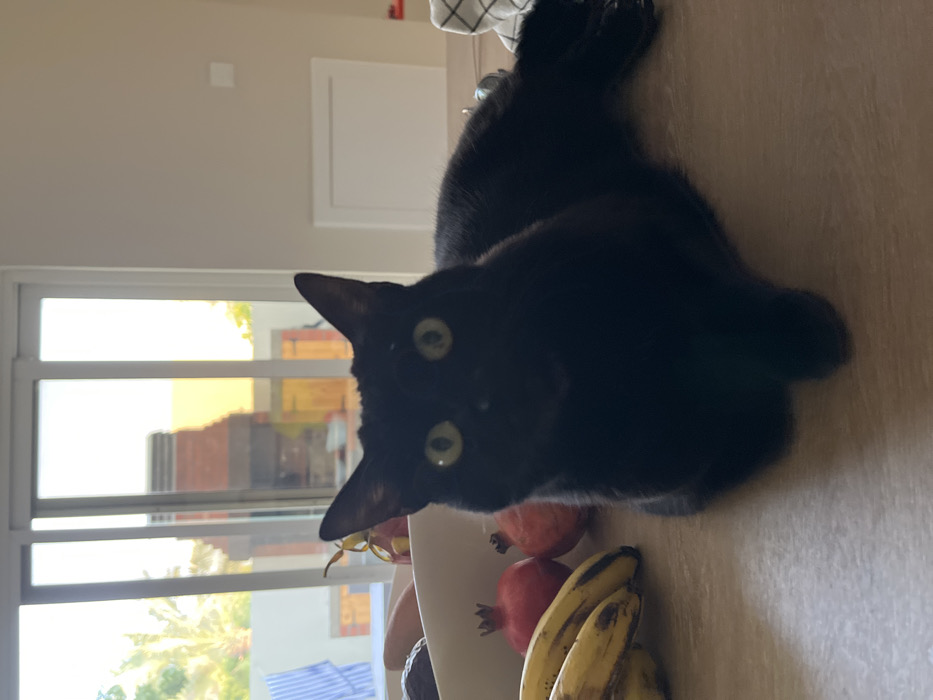 A black domestic cat with bright yellow-green eyes is positioned centrally on a light-colored wooden countertop, looking directly towards the viewer with dilated pupils. To the cat's left, a bunch of ripe yellow bananas and two red pomegranates are arranged on the countertop. A white bowl containing an avocado and another small decorative object is partially visible behind the fruit. In the background, a large sliding glass door reveals an exterior view. This view includes palm trees on the left and a building with a reddish-brown tiled roof and yellow-orange walls, indicative of architecture found in Ras Al-Khaimah, United Arab Emirates. The sky beyond is bright. The interior wall is light beige. On the right side of the countertop, a white and grey patterned cloth and some metallic items are partially visible. A white rectangular access panel is mounted on the wall to the right.