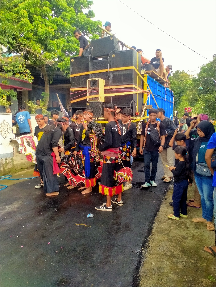 A group of people gathered on a wet street observe a cultural procession. Some participants wear traditional black tops and decorative shorts with yellow fringe, while others wear casual attire. A large speaker system is stacked on a blue truck in the background, with several people on top. Observers include children and adults, some barefoot. The atmosphere suggests a local celebration or performance.