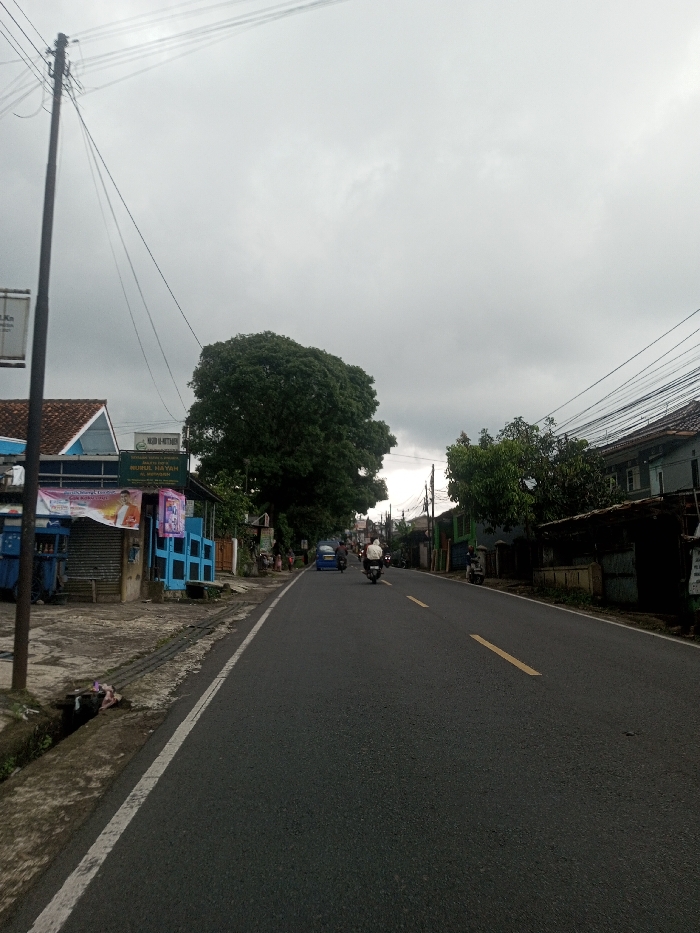 The image displays a two-lane asphalt road in Kandapola, Sri Lanka, under a uniformly overcast sky. The road features a solid white line on its left margin and broken yellow center lines, extending into the distance with a slight upward incline. On the left side of the road, a dark utility pole supports multiple overhead power lines in the foreground. Adjacent to it, a concrete and dirt gutter contains visible debris. Further back, a single-story building with a light blue facade, a brown tiled roof, and blue grates is visible. Banners, including one with a male figure, and a green sign reading "MASJID H-HIDAYAH" and "NURUL HAYAH" are affixed to this structure. A large, dense green tree stands behind this building. On the road, a person in a light-colored shirt is operating a dark motorcycle, moving away from the viewer in the right lane. Other indistinct figures and vehicles, including a blue vehicle and another motorcycle, are visible further down the road. A white scooter is parked stationary on the right side of the road, near the curb. The right side of the road is bordered by a series of single and two-story buildings with varying colored facades and tiled roofs, interspersed with trees and foliage. Multiple overhead power lines are also visible crisscrossing the upper right portion of the scene.