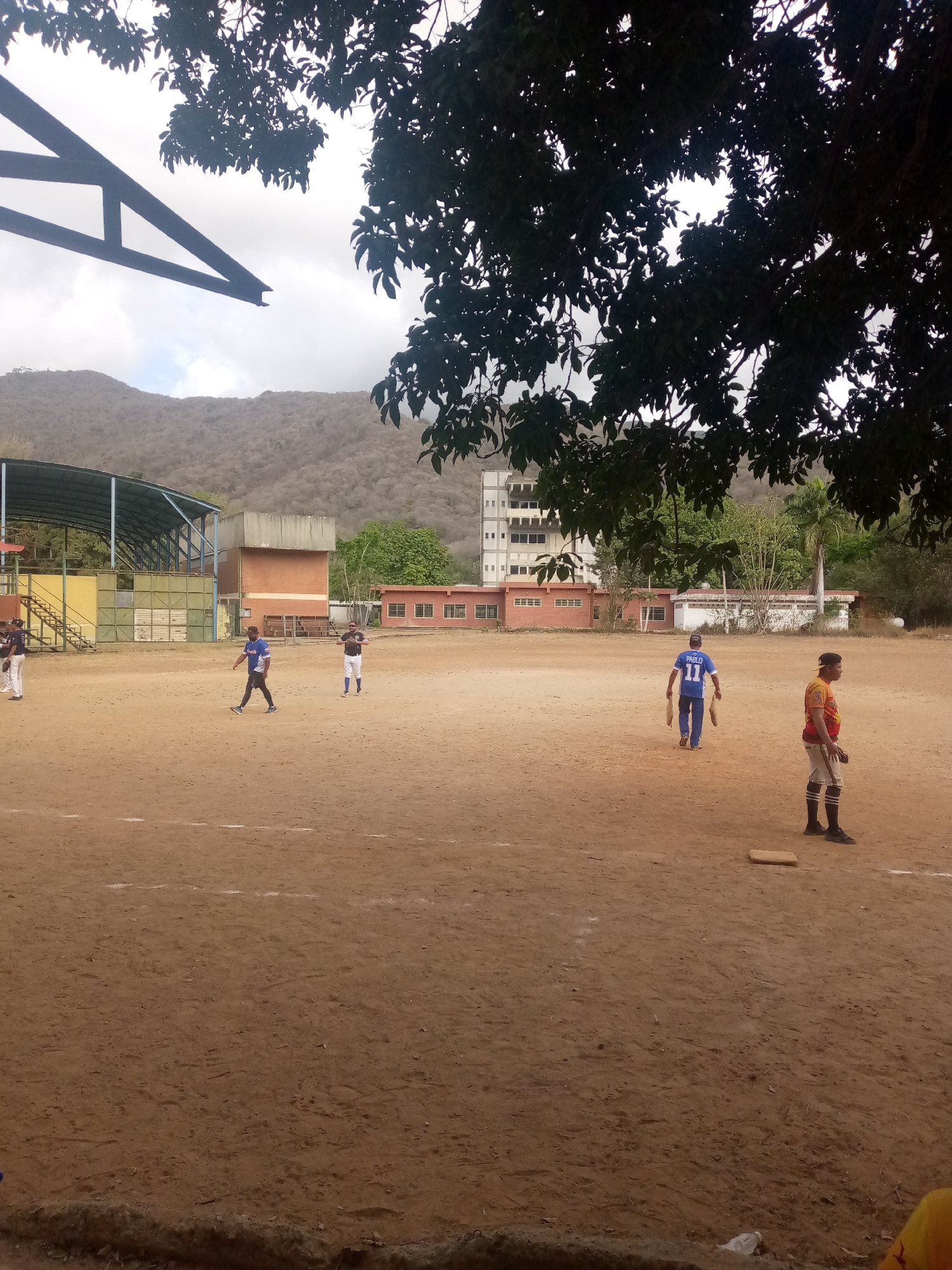 baseball field in Las Piedras, Venezuela. The field is mostly dirt with some sparse grass. There are five men on the field, four of whom are wearing baseball uniforms. One man is wearing a blue uniform with the number 11 on the back. Another man is wearing a red and yellow uniform and standing near a base. The other two men wearing baseball uniforms are wearing blue and white. In the background, there is a building with green framework with green and yellow walls, a multi-story building, smaller red buildings, and a mountain. There is a tree in the foreground, partially obstructing the view. The sky is cloudy.