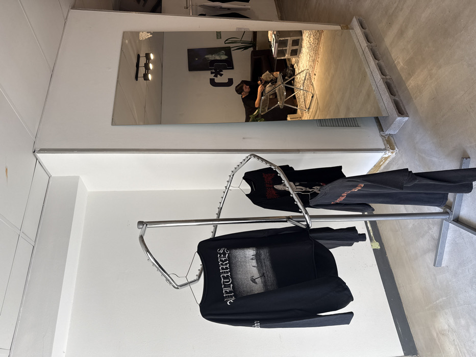 A clothing rack displays three black garments on hangers. One is a long-sleeved shirt with a landscape graphic, while the other two appear to be t-shirts with smaller designs. A large mirror reflects a room interior with seating and a person. The mirror's base sits on concrete blocks. The surrounding walls are white.