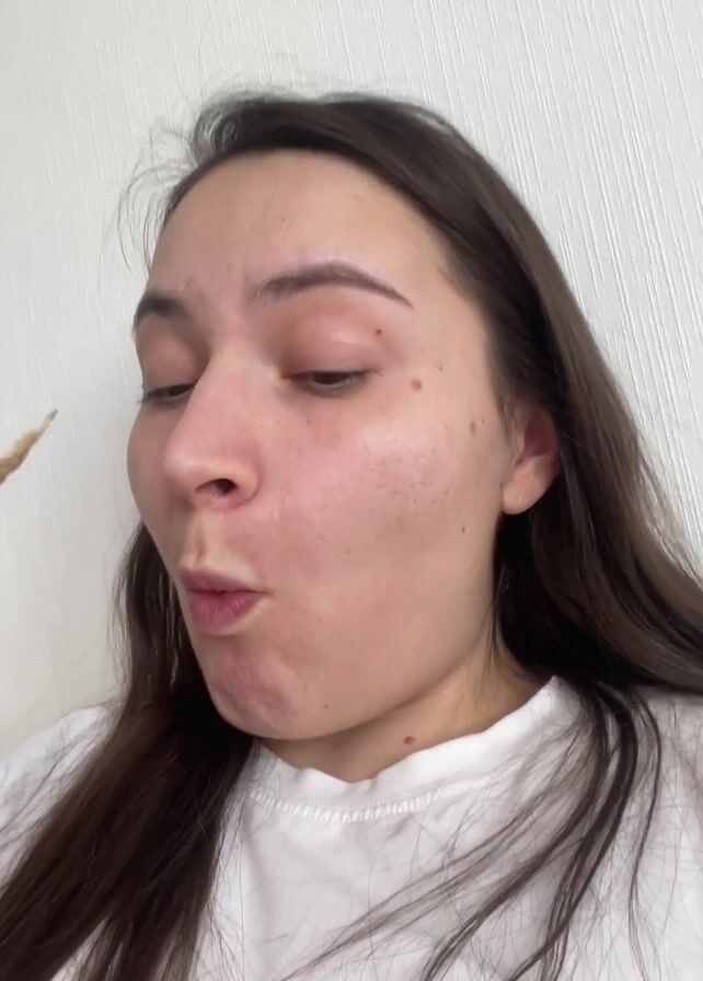 A young woman with long brown hair, wearing a white t-shirt, is eating a thin, rectangular cracker. She looks directly at the camera as she chews, her eyes moving and facial expressions changing as she savors the food. The background is a plain white wall with subtle vertical texture. The camera is positioned close to her face, capturing her expressions and the details of the cracker.