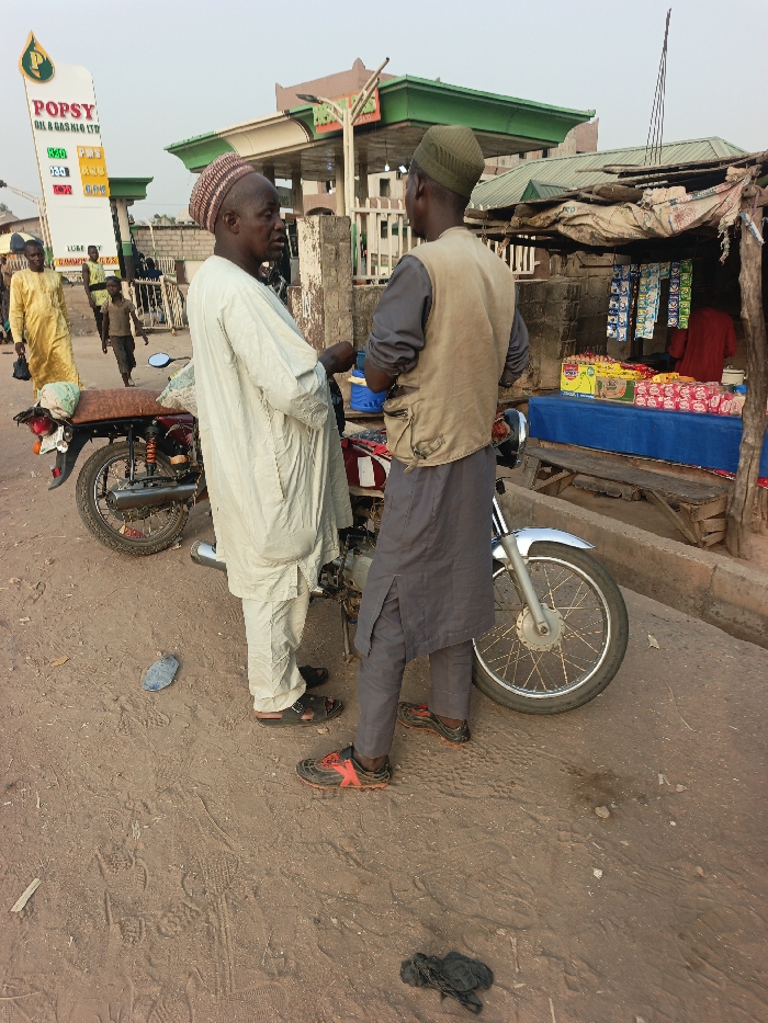 Two men in traditional clothing stand next to a red motorcycle, conversing on a dusty road. A gas station sign reading "POPSY OIL & GAS NIG LTD" is visible in the background. A small roadside stall selling snacks and beverages is situated to the right, under a makeshift awning. A man in a yellow robe walks by in the distance, with another child walking in the same direction. The ground is uneven, showing signs of wear.