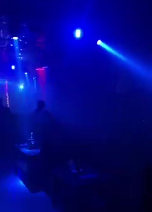 inside of a nightclub or bar, with people standing around. The lighting is low, with spotlights and colored lights illuminating the space. There is some fog or haze in the air. Tables and chairs are visible in the foreground, and a lit-up sign that says "ICONIA" can be seen further in the background.
