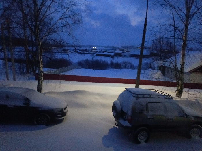 A snowy outdoor scene shows two parked cars, one dark and one SUV-style, both covered in snow. Bare trees stand in the background, framing a body of water dotted with distant structures, possibly a small village. A red railing runs horizontally across the midground. The sky is a gradient of dark blues, suggesting either dusk or dawn. The lighting is dim, enhancing the wintry and cold atmosphere.