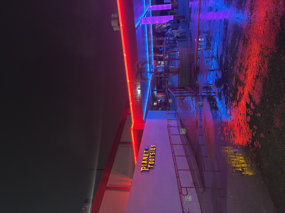 This image depicts the exterior of "PLANET TOOTSIES" at 18000 NW 37th Ave, Miami Gardens, Florida, United States, during nighttime conditions