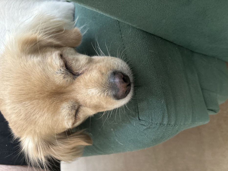 - "A golden-furred dog with its eyes closed rests its head on a green, cushioned surface, possibly a couch or chair" by FM-j80jY2, licensed under CC BY 4.0