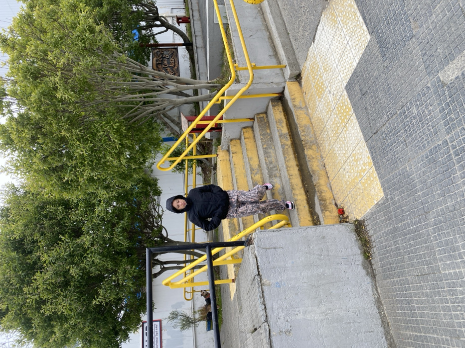 A person in a black jacket and patterned pants stands on a flight of yellow-railed concrete stairs. A large tree with lush green leaves is to the left. A gray concrete wall runs along the right side of the stairs, transitioning to a gray tiled surface. The photo is rotated, giving a tilted perspective of the scene.