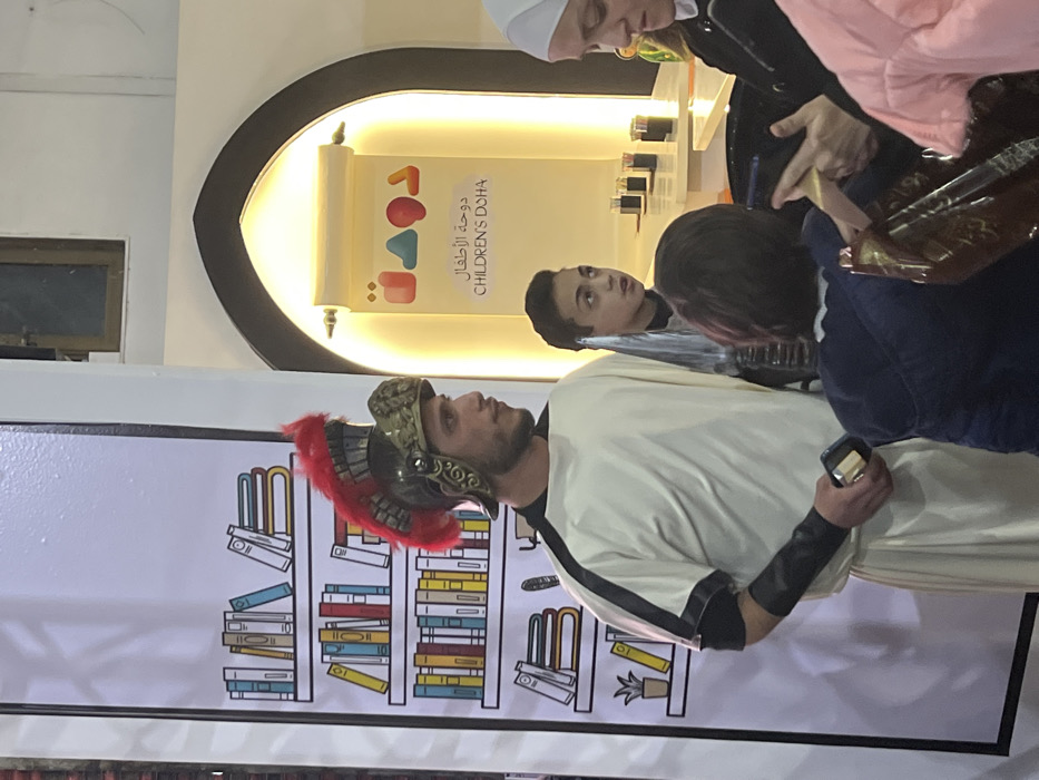 A man dressed as a Roman soldier in a helmet with red feathers stands next to a sign with a bookshelf illustration. A young boy and several adults stand in the background, some looking toward the Roman soldier. The scene appears to be indoors, possibly at an event related to children's literature or reading, indicated by a sign above that says "Children's Doha" in Arabic and English. One person seems to be taking a photo of the Roman soldier.