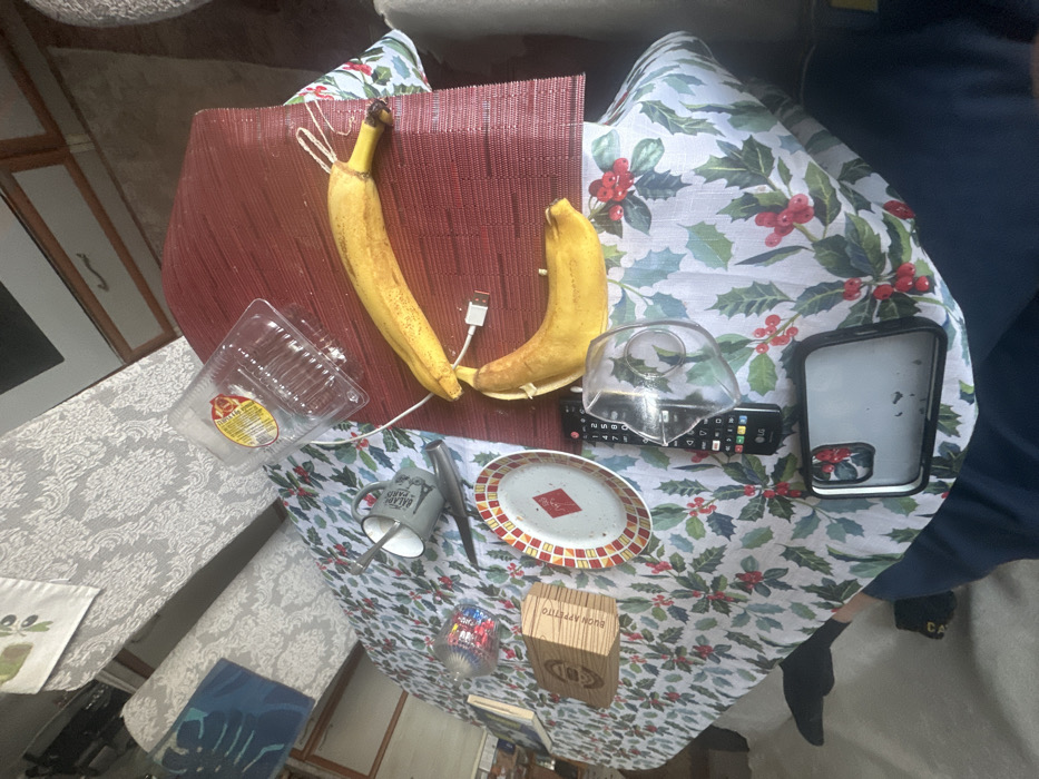 The scene depicts an indoor domestic environment, identified as a location within the city of General Toshevo, Bulgaria. A dining or living room table is central to the composition, viewed from an elevated perspective. The table is covered with a white tablecloth adorned with a repeating pattern of green holly leaves and red berries. On the tablecloth, a variety of items are present. Toward the left, a light brown wooden box with the text "BUON APPETITO" is positioned vertically. Next to it, a clear glass jar is filled with numerous colorful, circular candies. Further right, a grey mug featuring the text "BALADE A PARIS" and an Eiffel Tower graphic contains a silver spoon. Adjacent to the mug, a silver knife rests flat on the tablecloth. A round plate with a geometric pattern of red, white, and yellow concentric rings and squares holds crumbs and a small red square decal in its center. A black LG brand remote control is situated near the bottom edge of the plate. To its immediate right, a clear, empty wine glass or tumbler lies on its side. On a red woven placemat situated on the right side of the tablecloth, two ripe yellow bananas are displayed. One banana is partially peeled from its stem end, revealing the fruit, into which a white USB charging cable is inserted. The second banana lies unpeeled beside it. Above the bananas, a clear, empty plastic container with a yellow label, possibly a food packaging item, is partially open. In the foreground, a person's lower body is visible, clad in dark blue pants and dark socks or shoes. An iPhone, encased in a dark protective cover, is placed face down on the tablecloth near the person's lap. The background shows a light-colored sofa or armchair with a patterned upholstery. Beyond this, a light-colored cabinet with a dark handle is partially visible, suggesting a kitchen or other living space. An additional patterned textile, possibly a table runner with an olive branch design, is draped over a surface in the upper left background.