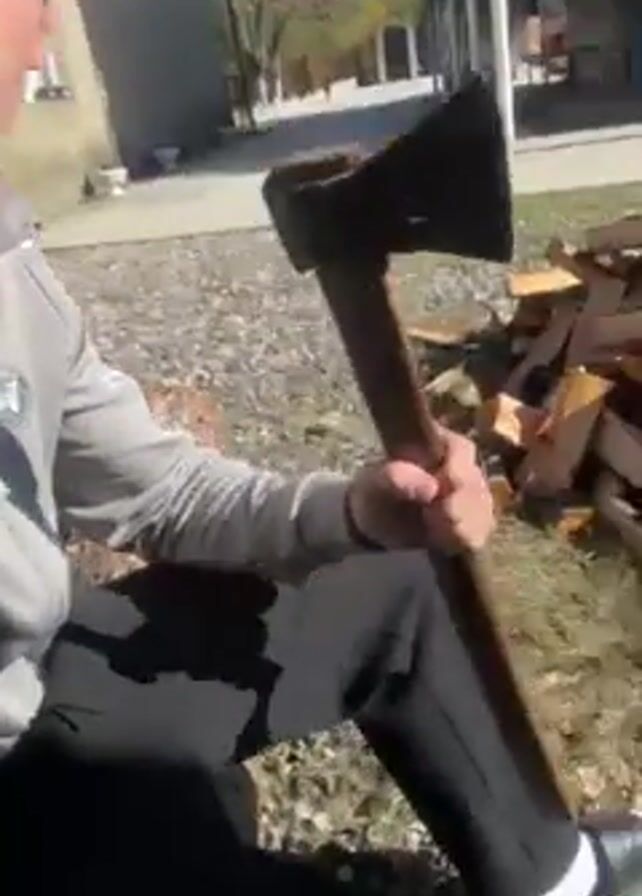 A young man stands outdoors, holding an axe in front of his face. He is wearing a grey zip-up sweatshirt and black pants. The background includes a building and laundry hanging on a line. He moves to a seated position next to a large pile of chopped firewood. He raises the axe and brings it down onto a log on the ground, presumably splitting it. He is wearing black slides with white socks. The ground appears to be covered with gravel or small stones. The sky is clear and blue.
