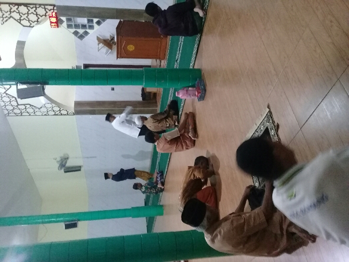 The image depicts a scene inside a mosque in Cangkuang, Indonesia (latitude: -7