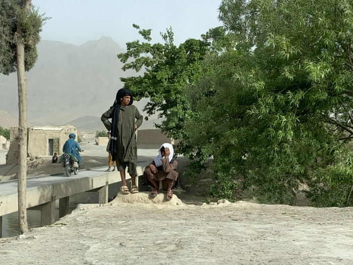 The scene is taken in Sard-E 'olya, Afghanistan, at the coordinates 31.707, 65.705. The photograph shows a dusty dirt road leading to a concrete bridge. Three men are standing on the bridge looking towards the camera. Two of the men are wearing traditional long robes. The man on the left is wearing a green robe with black trim, while the man on the right is wearing a brown robe. The man in the middle is wearing a blue robe and is sitting on a motorbike. Behind the men, there is a low-lying mud-brick building. To the right, there is a large, green tree. The image captures a moment of daily life in a rural Afghan village. There are mountains in the distance, and the ground is dusty. The weather appears to be bright and sunny, with a slight haze in the air. There are no other people or animals in the image.