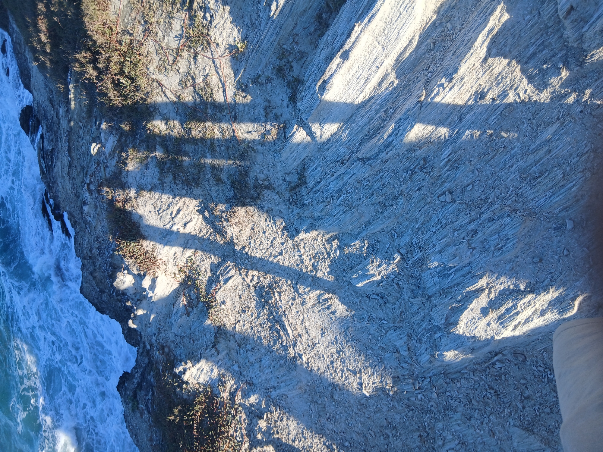 The image depicts a cliffside view, likely taken from above. The left side of the frame shows the ocean with visible wave action. The cliff face is composed of light-colored, layered rock formations. Vegetation is sparsely distributed along the cliff edge. Shadows, possibly cast by a structure, are visible across the rock surface. The location is Unknown, Unknown. No people are visible.