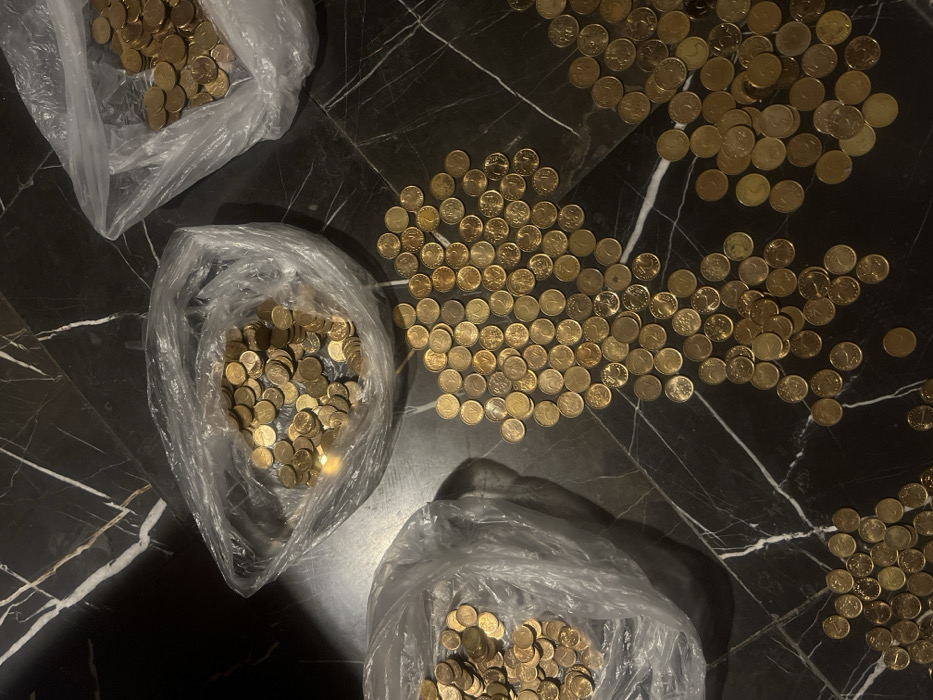 - "The scene, located in the city of Sofia, Bulgaria, depicts a significant quantity of gold-colored coins, visually consistent with 10 euro cent denominations, scattered and contained within plastic bags on a dark, polished marble surface" by FM-Sw3932, licensed under CC BY 4.0