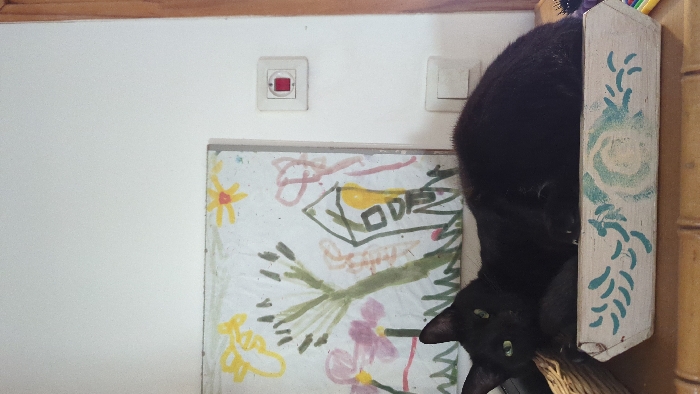 The image displays an indoor residential scene within Modiin-Maccabim-Reut, Israel. A black cat with green eyes is positioned in the lower-center, lying inside a light-colored wooden box decorated with blue-green painted patterns. The cat's head is raised, directed forward, with one claw partially visible on its right paw. Behind the cat, a child's drawing featuring yellow and pink flowers, a green tree, and a house with a yellow roof, is displayed against a white wall. On the white wall to the right of the drawing, a white square electrical switch with a prominent red circular button is mounted above a second white square electrical fixture. A narrow vertical wooden frame element is visible along the far right edge of the image. The cat's box rests on a flat, brown surface. A section of a woven basket is visible to the left of the cat, and a purple-handled comb is partially visible to the right.